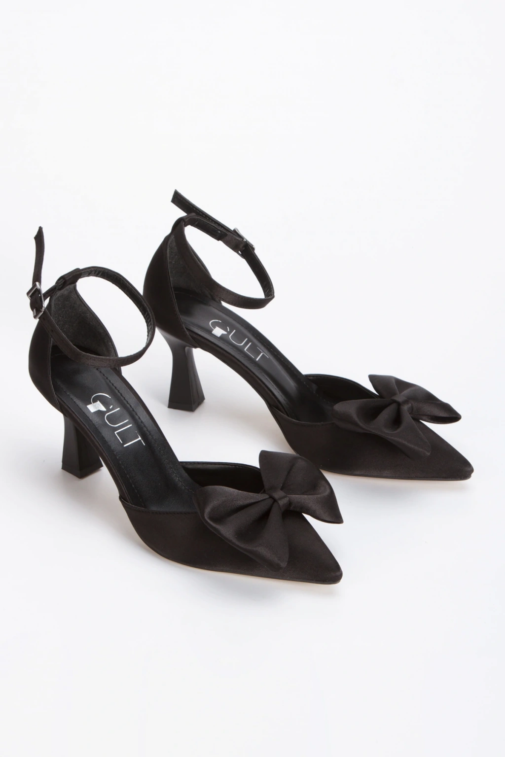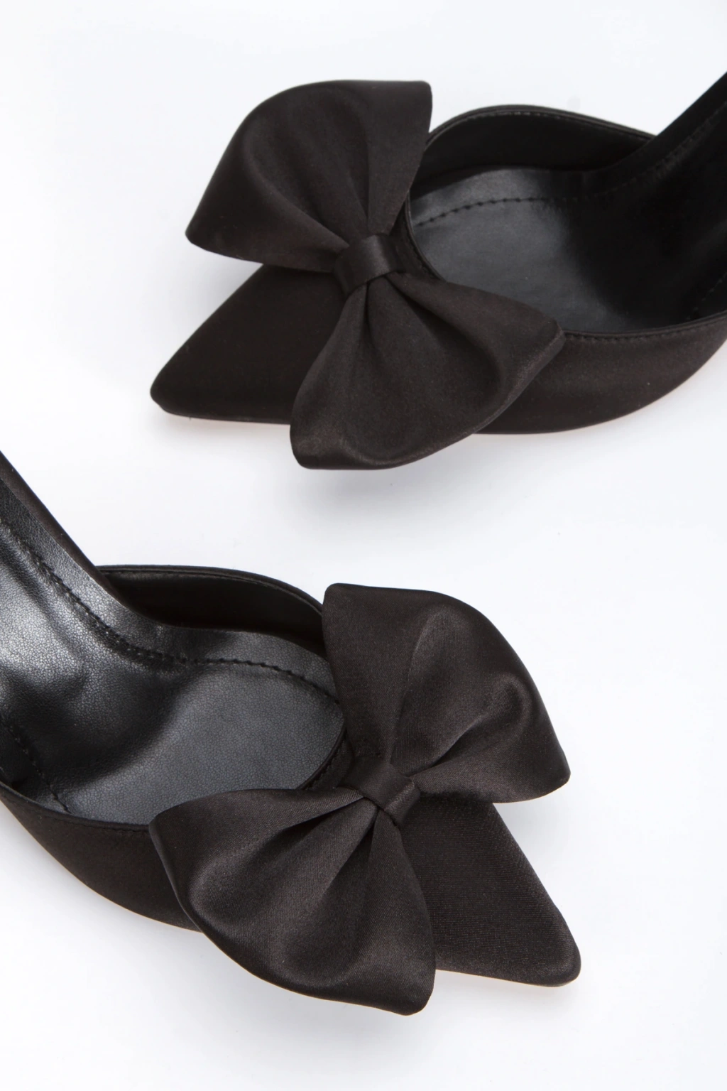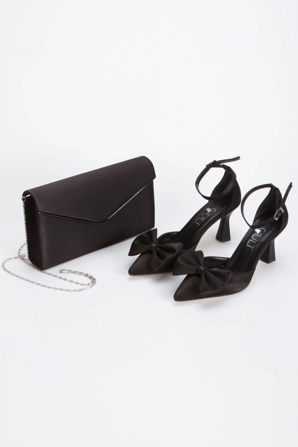 Kadın Siyah Şık Fiyonklu Kısa İnce Topuklu Sivri Burunlu Şık Stiletto ve Çanta Kombini