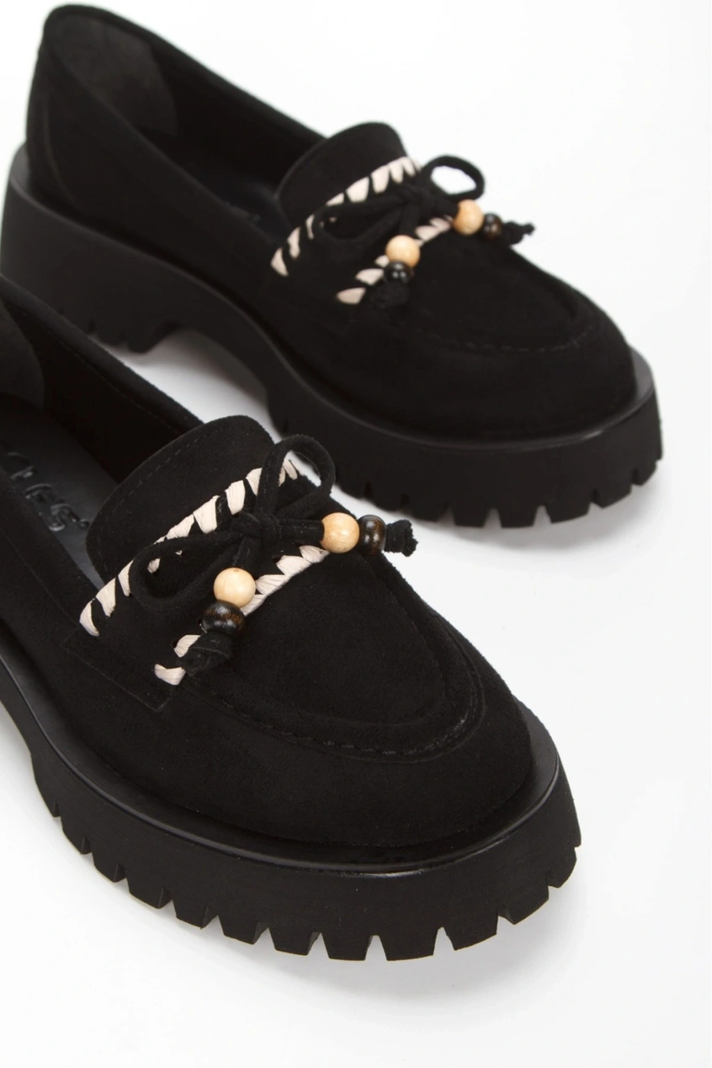 Kadın Siyah Süet Şık Fiyonk Detaylı Rahat Loafer Ayakkabı