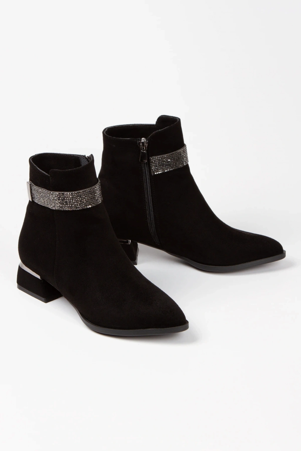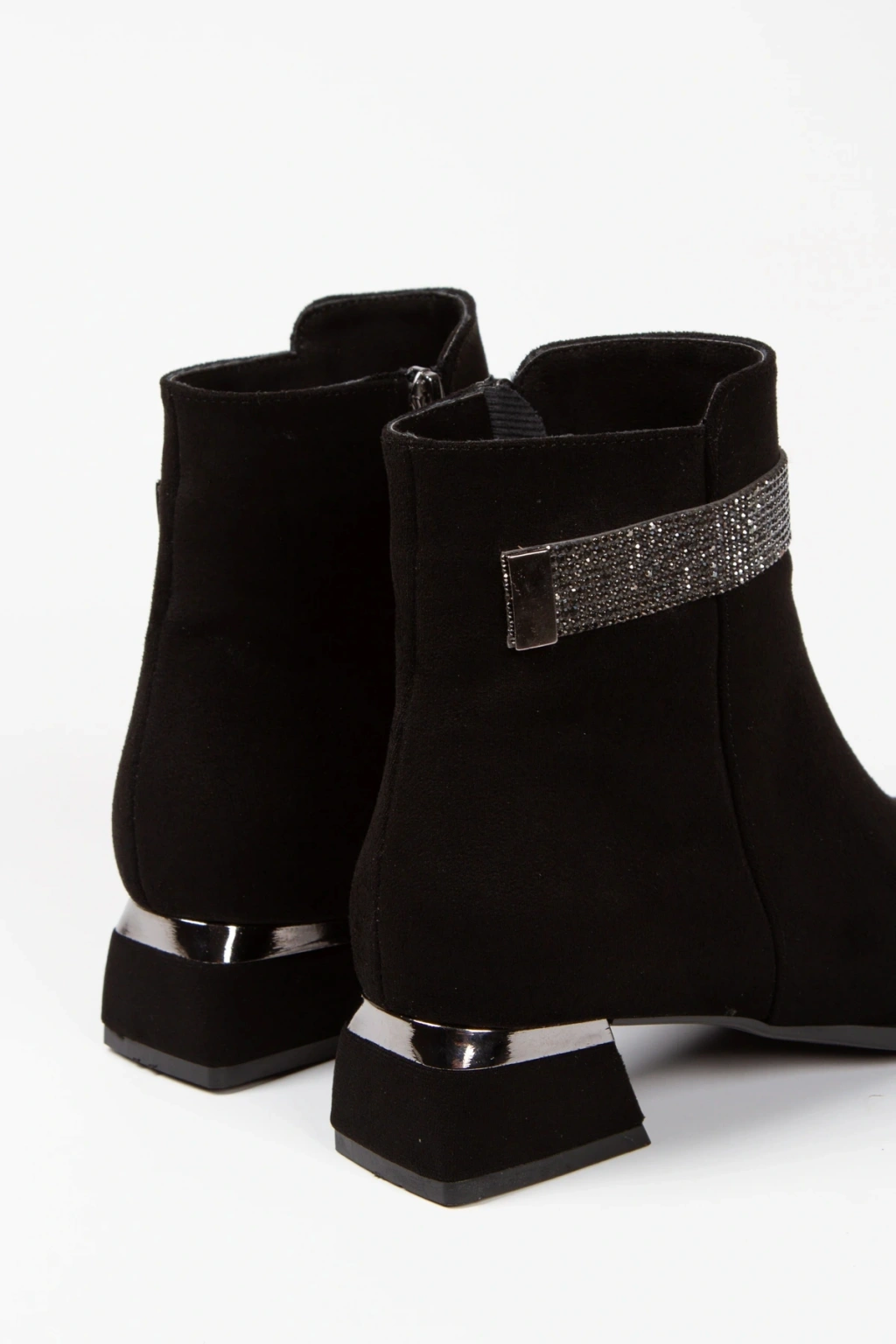 Kadın Siyah Süet Şık Parlak Taş Bant Detaylı Galvaniz Kalın Topuklu Rahat Bot