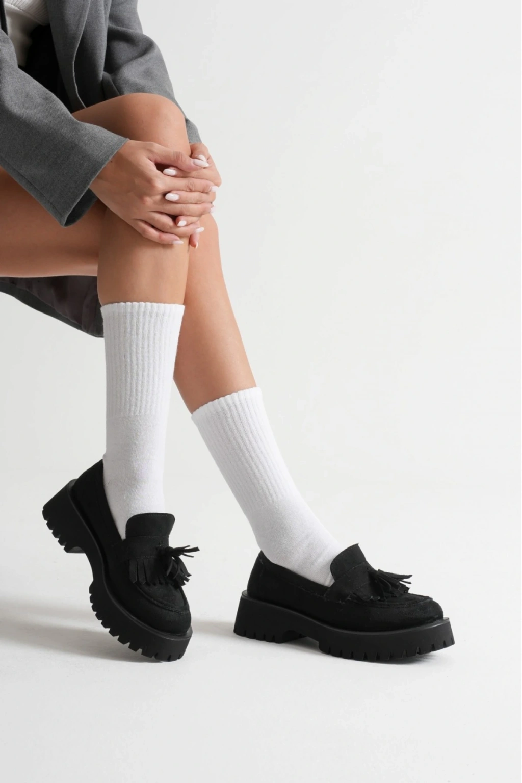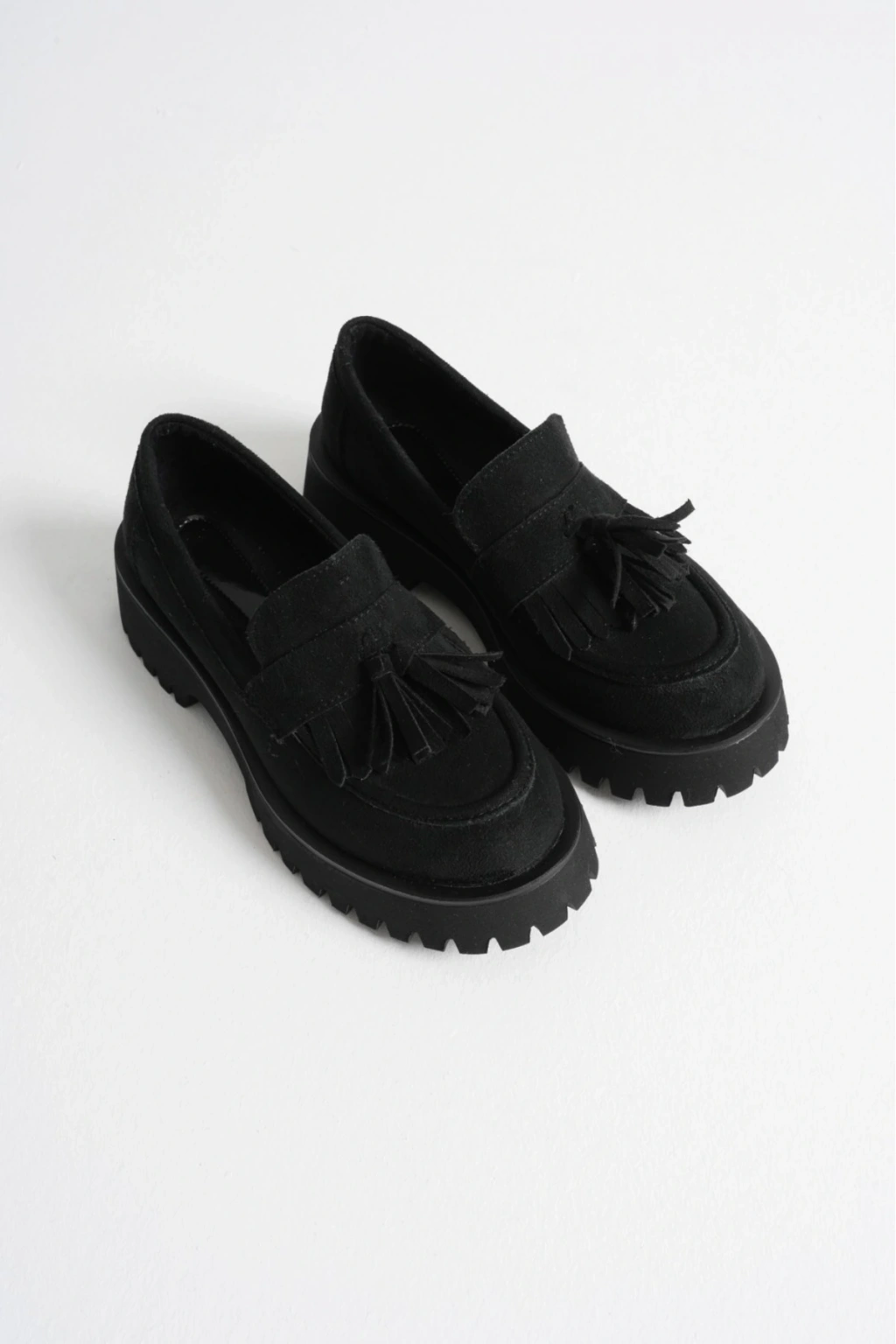 Kadın Siyah Süet Şık Püskül Detaylı Kalın Tabanlı Rahat Loafer Ayakkabı