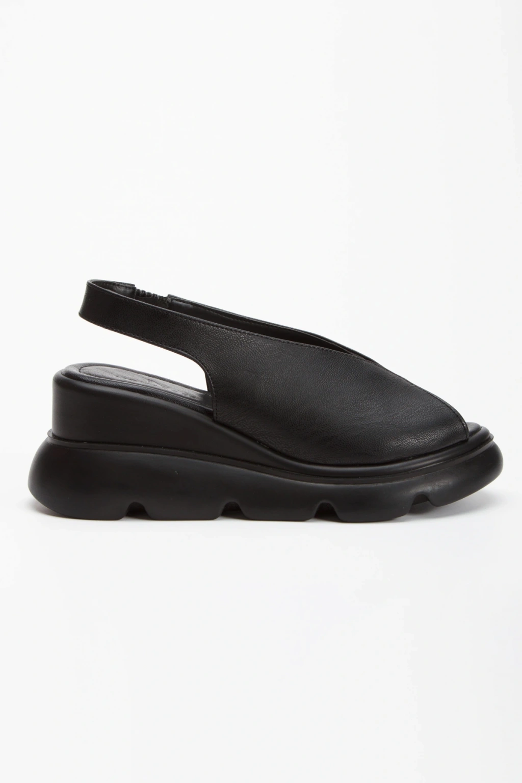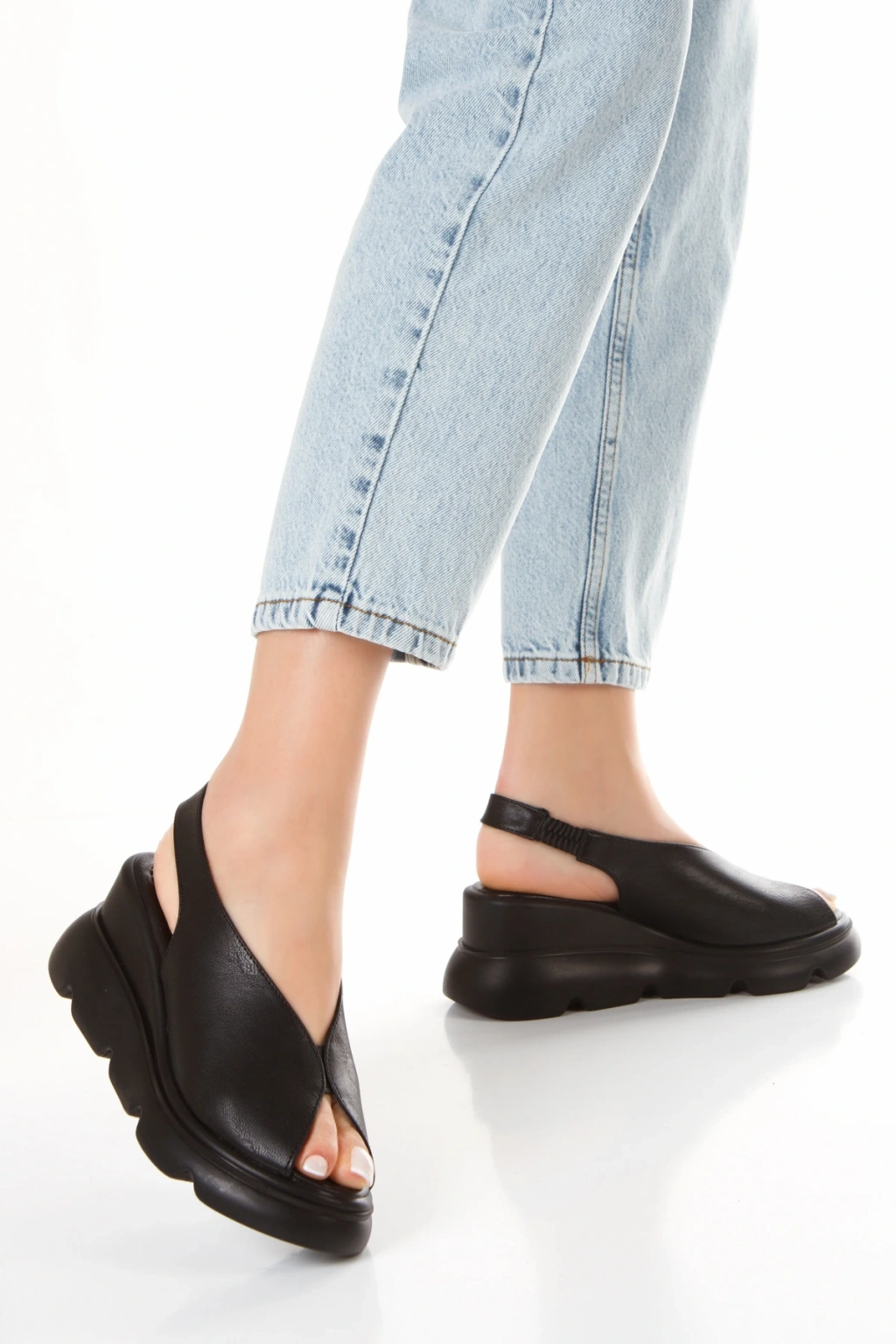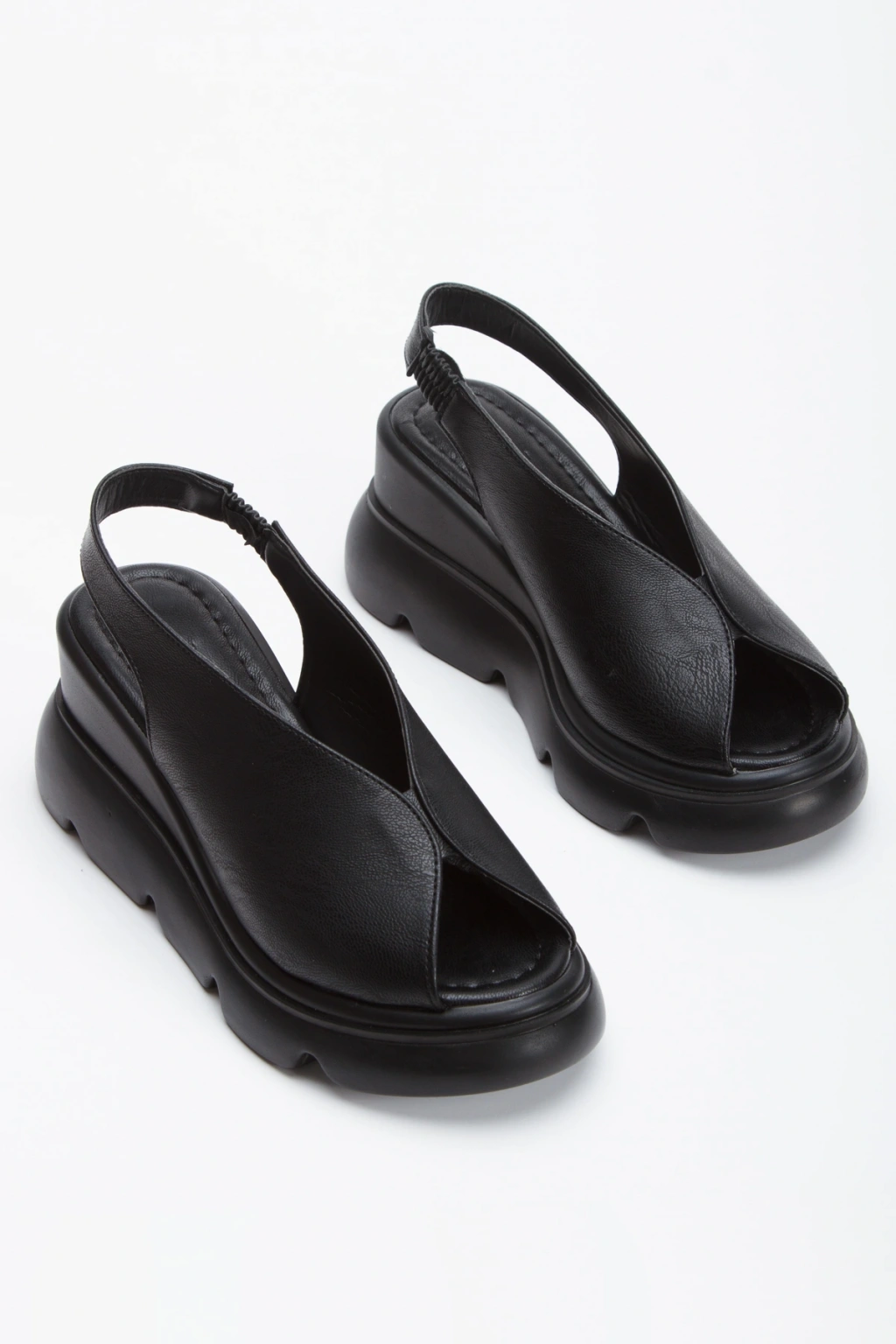 Kadın Siyah Suni Deri Cilt Yüksek Kalın Tabanlı Arkası Lastikli Rahat Sandalet