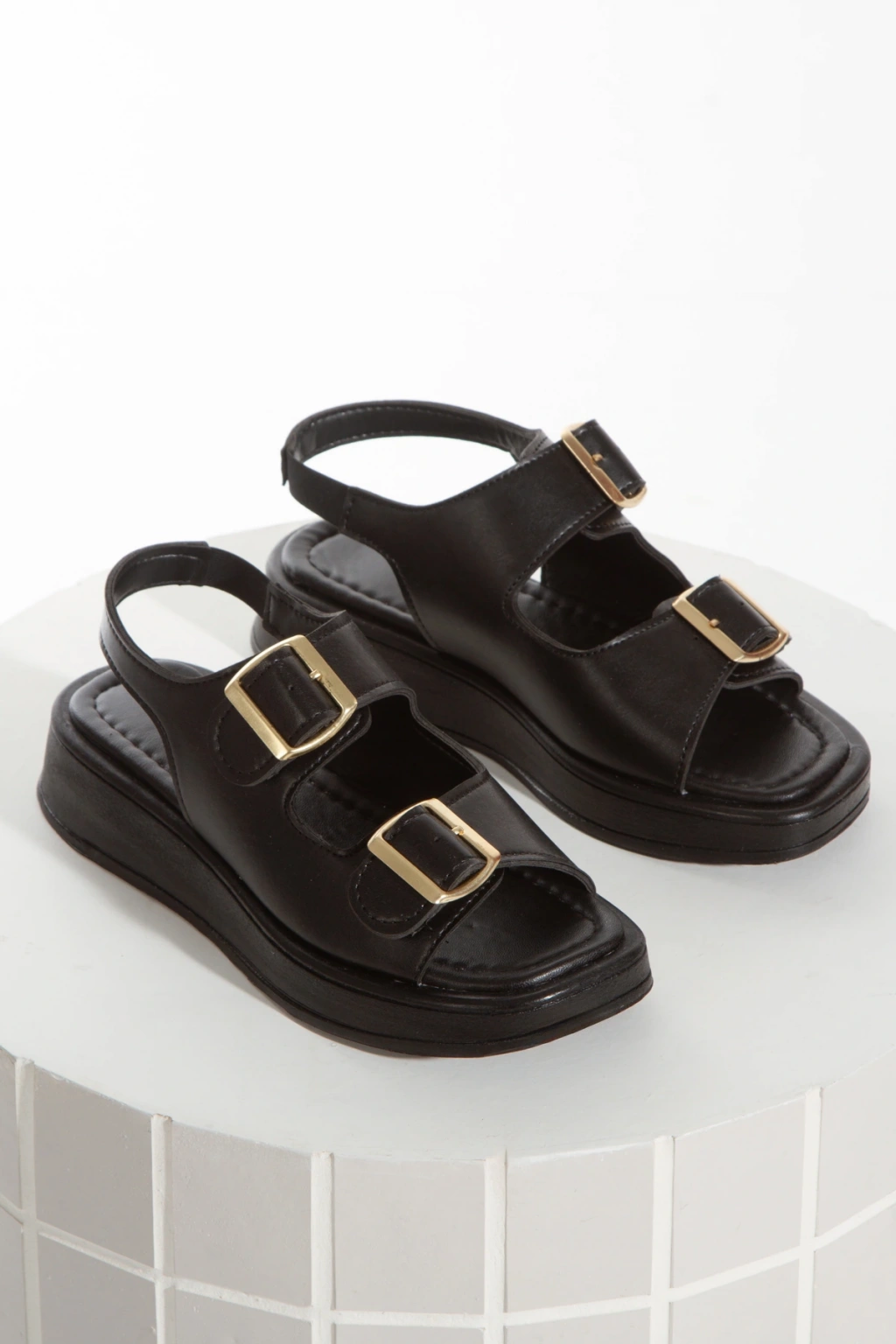 Kadın Siyah Yumuşak Tabanlı ve Çift Toka Detaylı Kalın Rahat Tabanlı Yazlık Sandalet