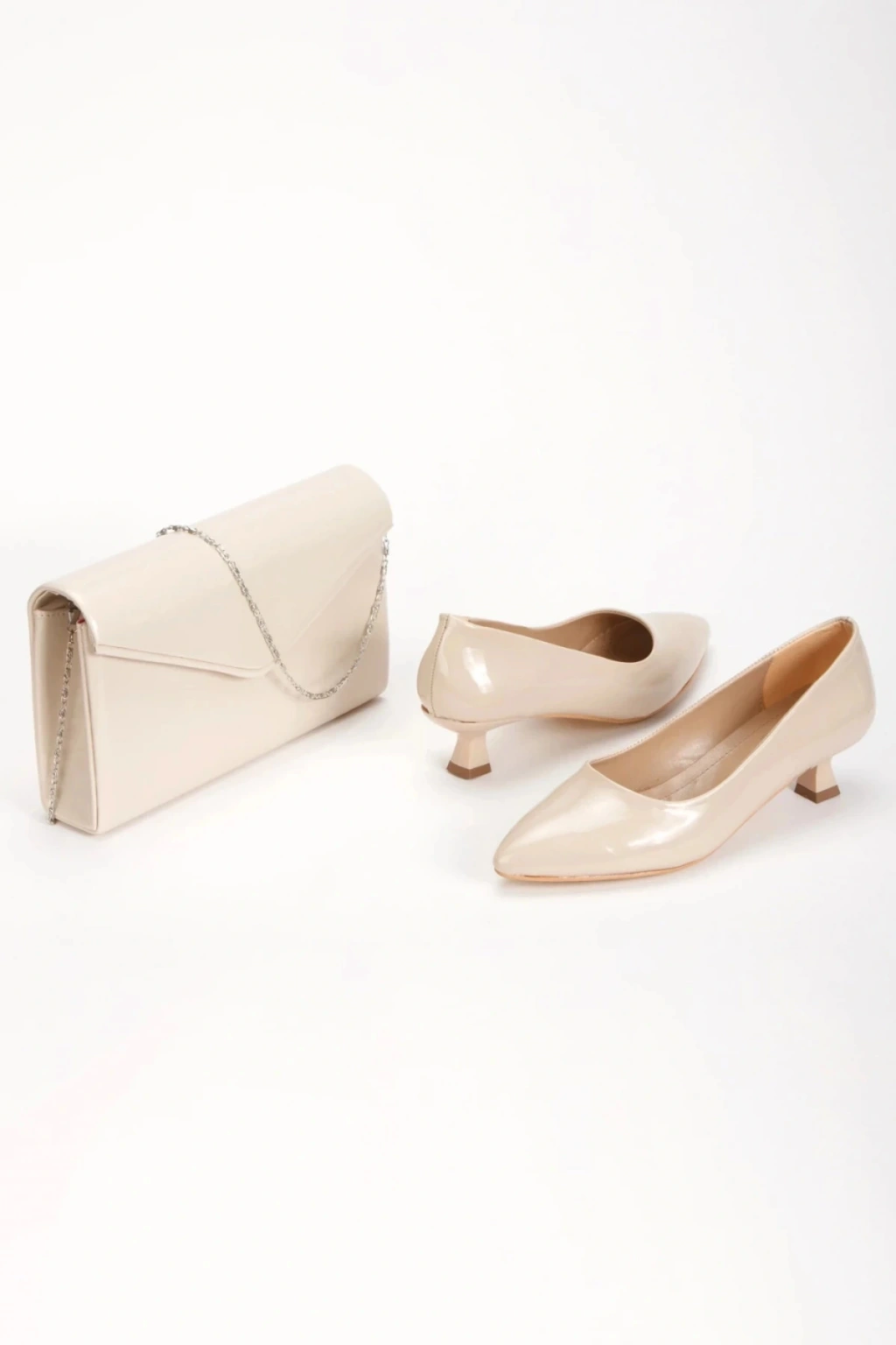 Kadın Ten Kısa Kadeh Topuklu  Rahat ve Şık Stiletto ve Çanta Kombini