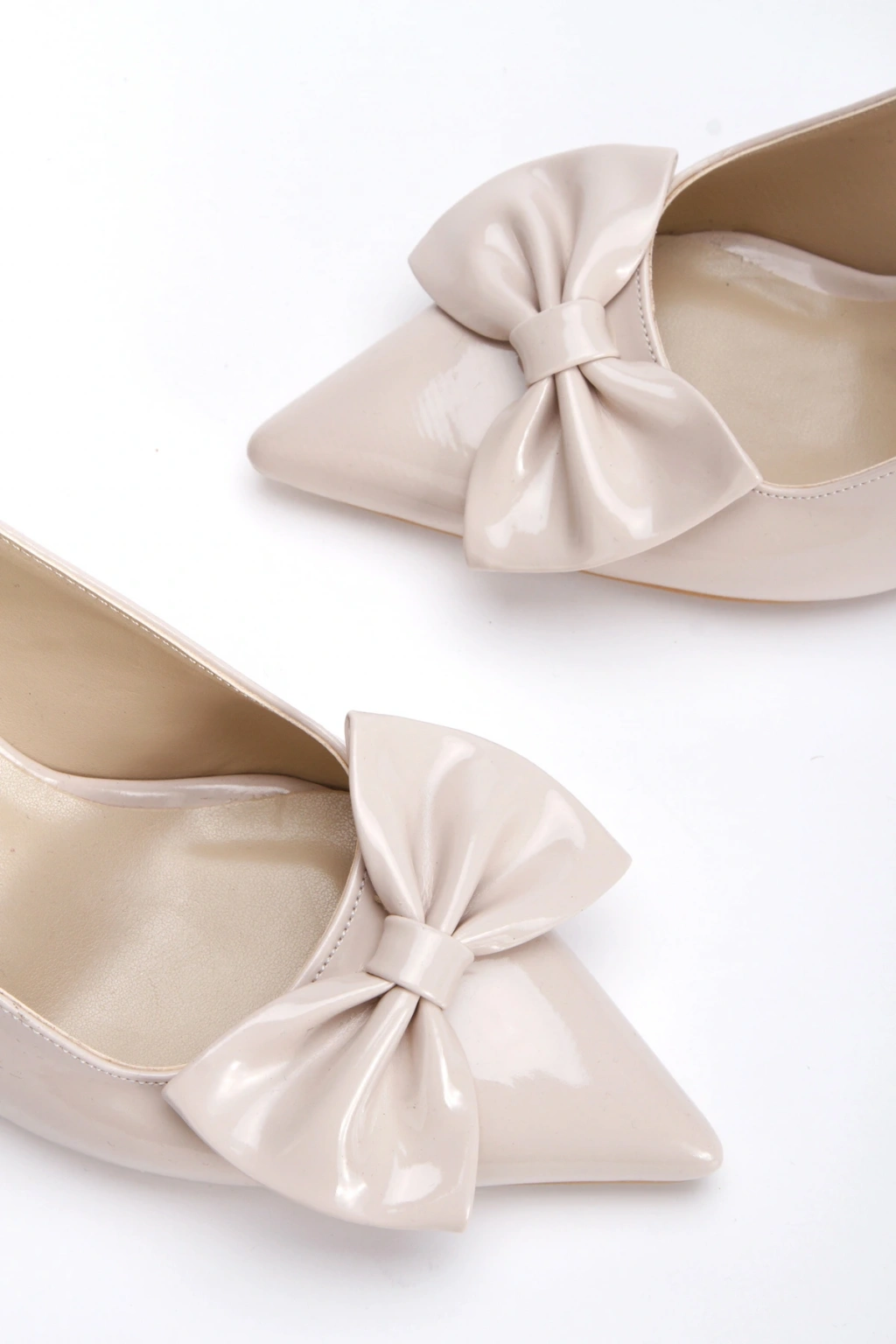 Kadın Ten Rugan Fiyonklu Kısa İnce Topuklu Sivri Burunlu Şık Stiletto Ayakkabı