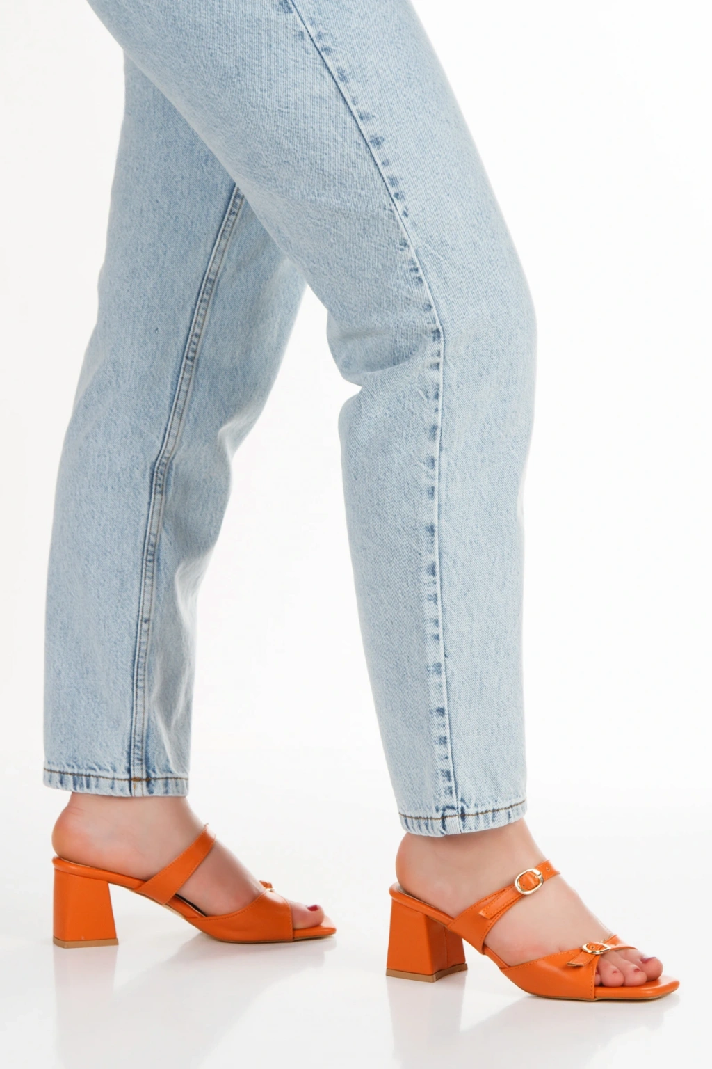 Kadın Turuncu Suni Deri Cilt Kalın Topuklu Şık Toka Detaylı Rahat Terlik