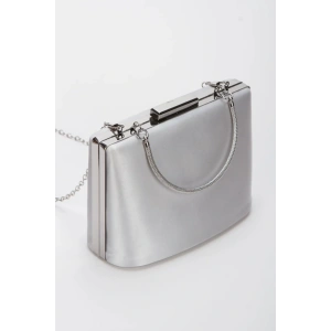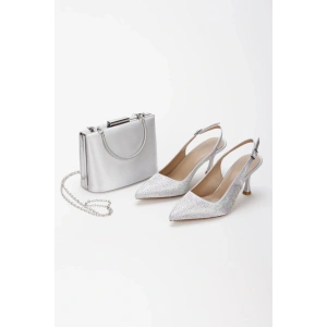 Kadın Gümüş Saten 7 cm İnce Topuklu Şık Damla Taşlarla Bezenmiş Rahat Stiletto ve Çanta Kombini