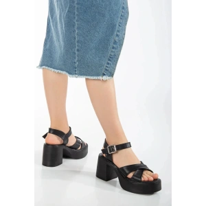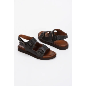Kadın Siyah Suni Deri Cilt Yumuşak Tabanlı ve Kalın Rahat Tabanlı Yazlık Sandalet