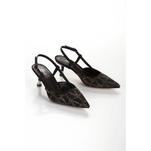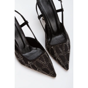 Kadın Siyah Saten Desenli Taşlarla Bezenmiş 5 cm İnce Galvaniz Topuklu Rahat Stiletto